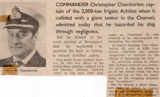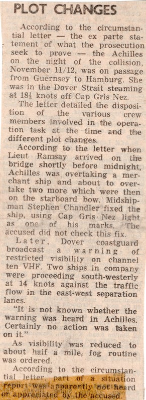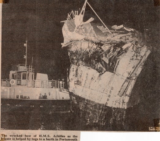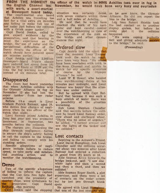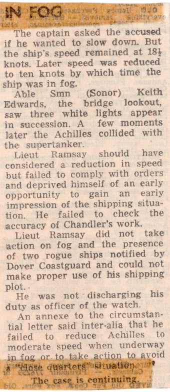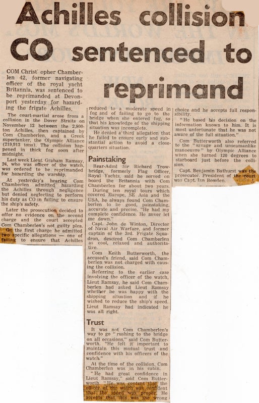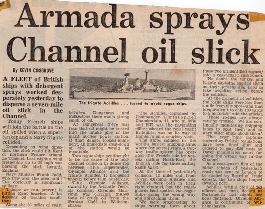 On the morning of 12 November 1975, the oil tanker Olympic Alliance and the Royal Navy Frigate HMS Achilles collided in Dover Strait, while sailing in thick fog. This resulted in two holes on starboard, tank N°5, of the tanker. The first one was situated just below the deck line and the other around one meter below water line. The Olympic Alliance lost about 2,000 tonnes of oil just after the collision. Despite this, both vessels later continued their way towards their respective destinations; the HMS Achilles to Portsmouth and the Olympic Alliance to Wilhemshaven in Germany. The latter however lost an additional 10,000 tonnes of oil on her way. She arrived in Germany on 15 November and anchored off Wilhemshaven. On 18 November it was decided to pump oil from tank N°5 and to transfer it to other tanks in the ship. This done the Olympic Alliance was allowed to sail into the harbour for unloading.